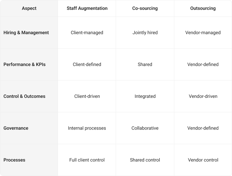 Staff Augmentation vs. Co-sourcing vs. Outsourcing